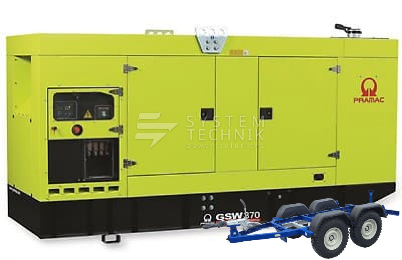 - Дизельный генератор Pramac GSW 370 V 400V В кожухе на прицепе